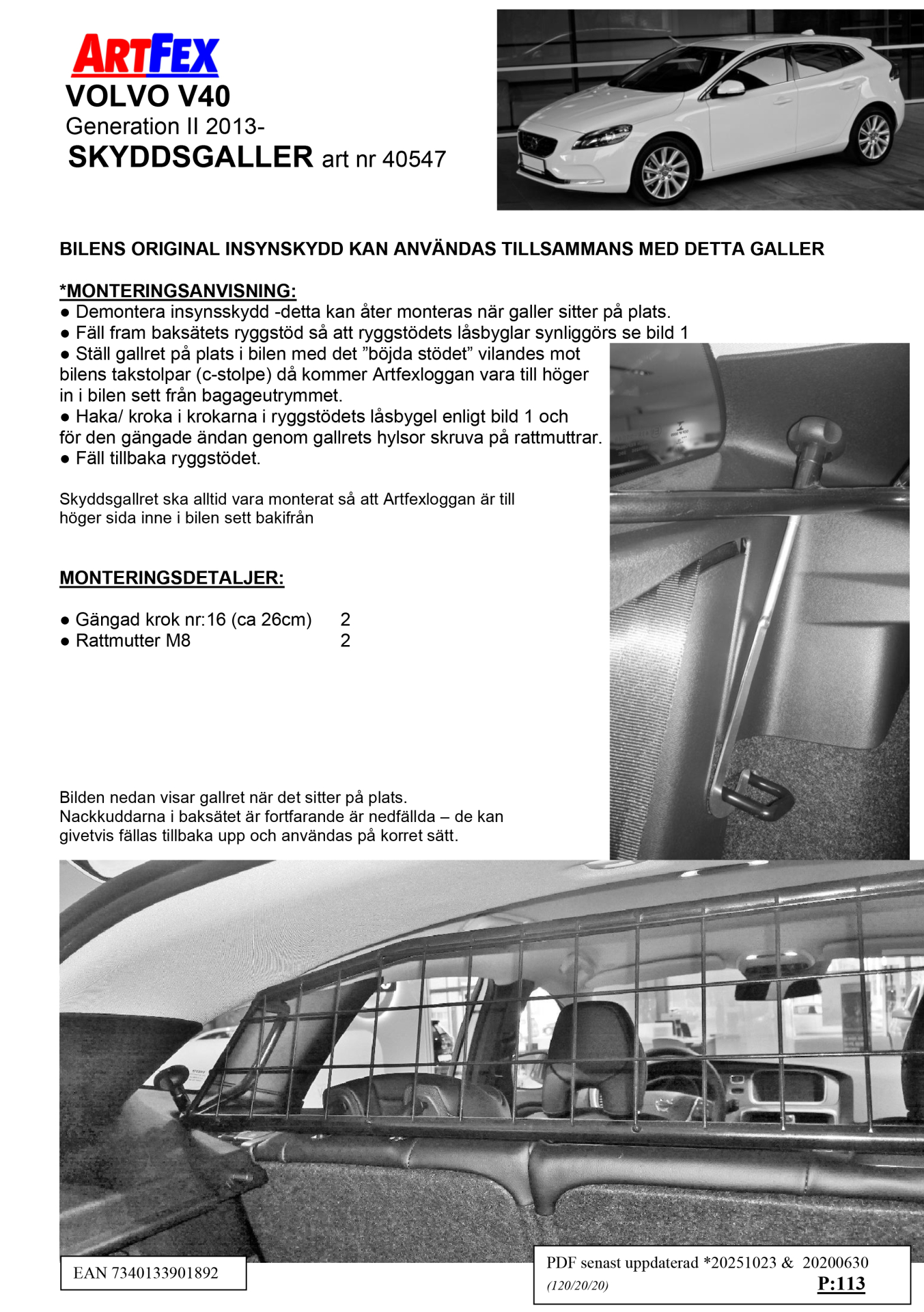 Kjør trygt i bilen med Artfex svenskproduserte laste/beskyttelsesgitter for Volvo V40