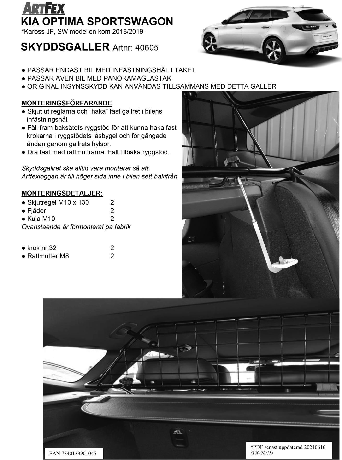 Kjør trygt i bilen med Artfex svenskproduserte laste/beskyttelsesgitter Kia Optima