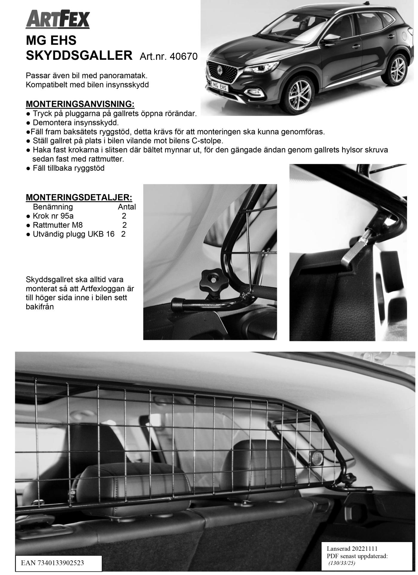 Kjør trygt i bilen med Artfex svenskproduserte laste/beskyttelsesgitter for MG EHS