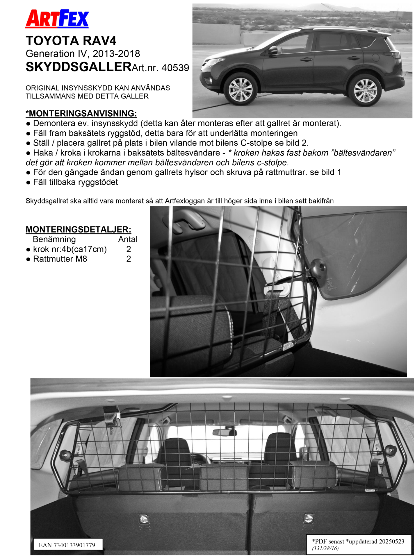 Kjør trygt i bilen med Artfex svenskproduserte laste/beskyttelsesgitter Toyota Rav 4