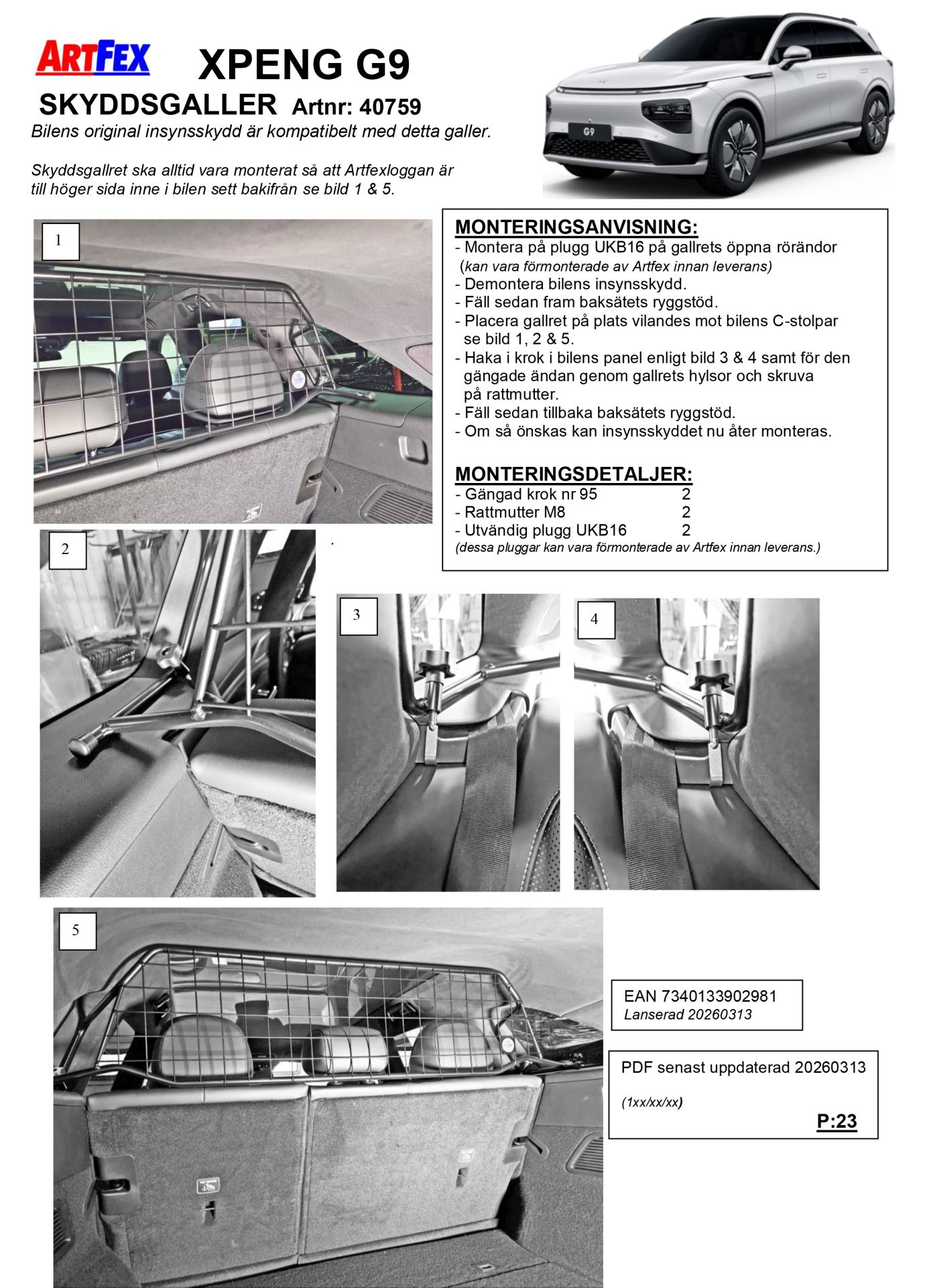 Kjør trygt i bilen med Artfex svenskproduserte laste/beskyttelsesgitter for XPENG G9